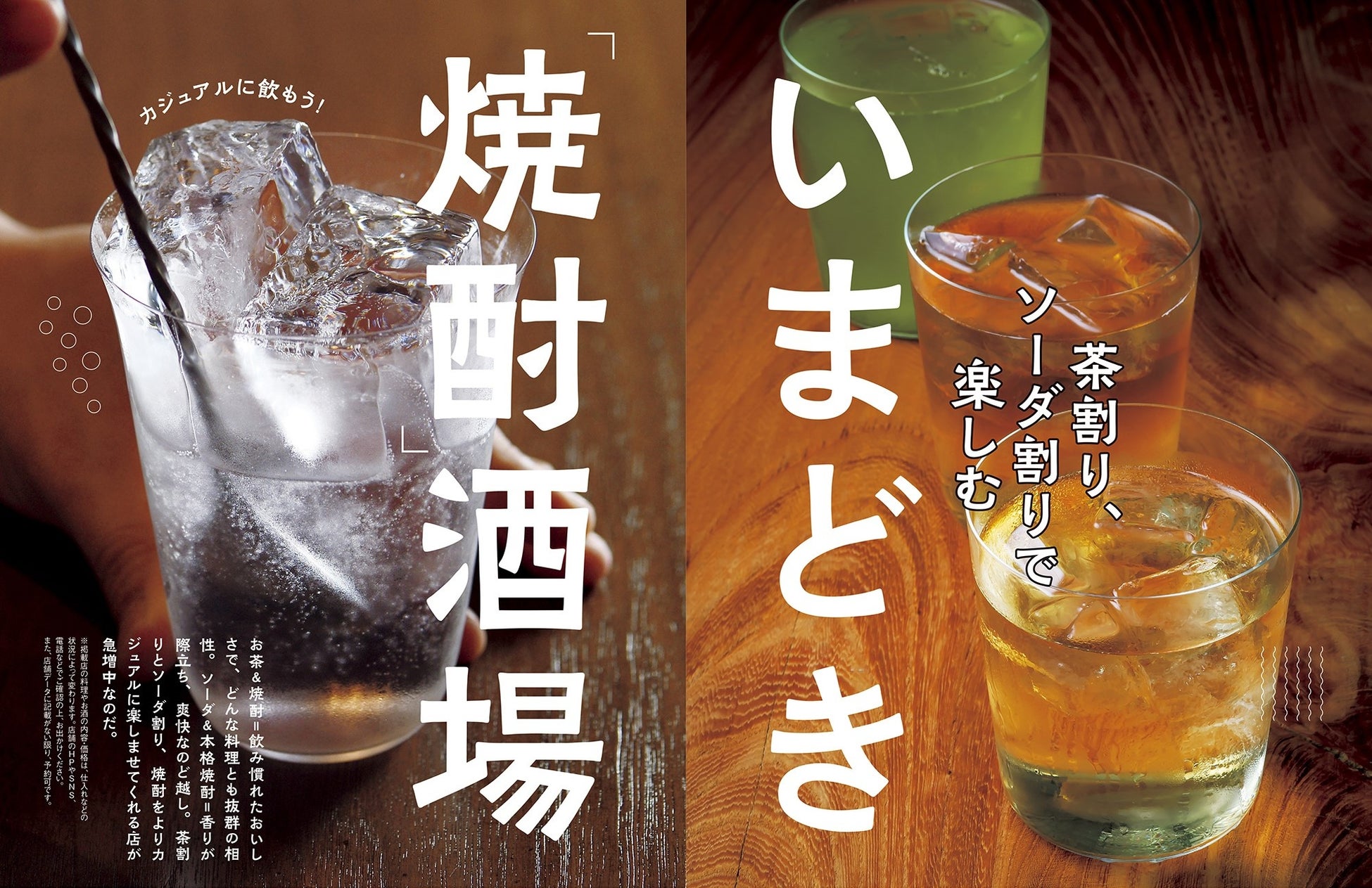 お茶&焼酎=飲み慣れたおいしさで、どんな料理とも抜群の相性。ソーダ&本格焼酎=香りが際立ち、爽快なのど越し。そんな茶割りとソーダ割り、焼酎をよりカジュアルに楽しませてくれる店が急増中です。中でも厳選の良店をお届けします。