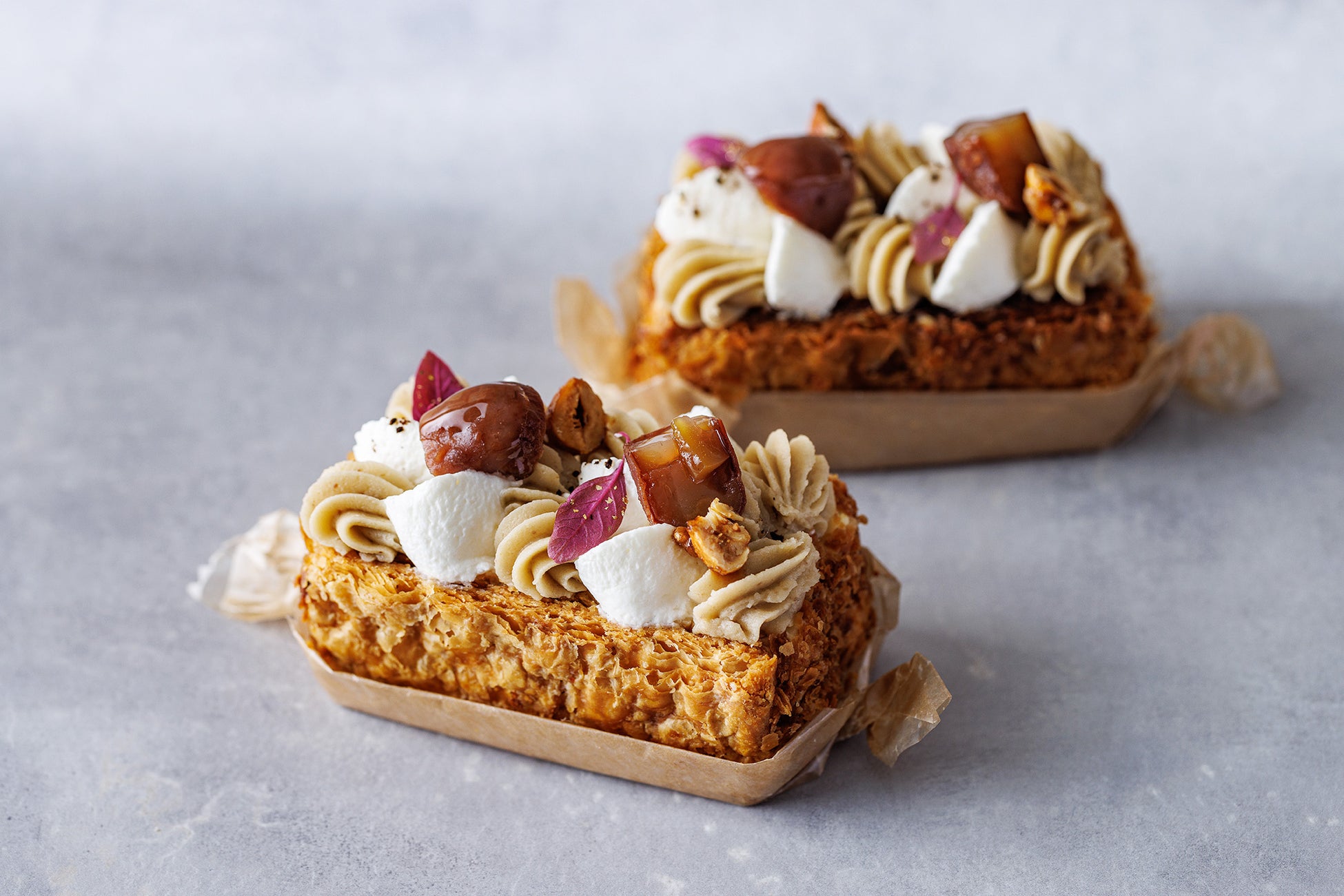 空気をたっぷりと含んださくさくのパイ生地に、和栗クリーム、ラム酒を効かせたコーヒームース、ビターチョコを合わせました。