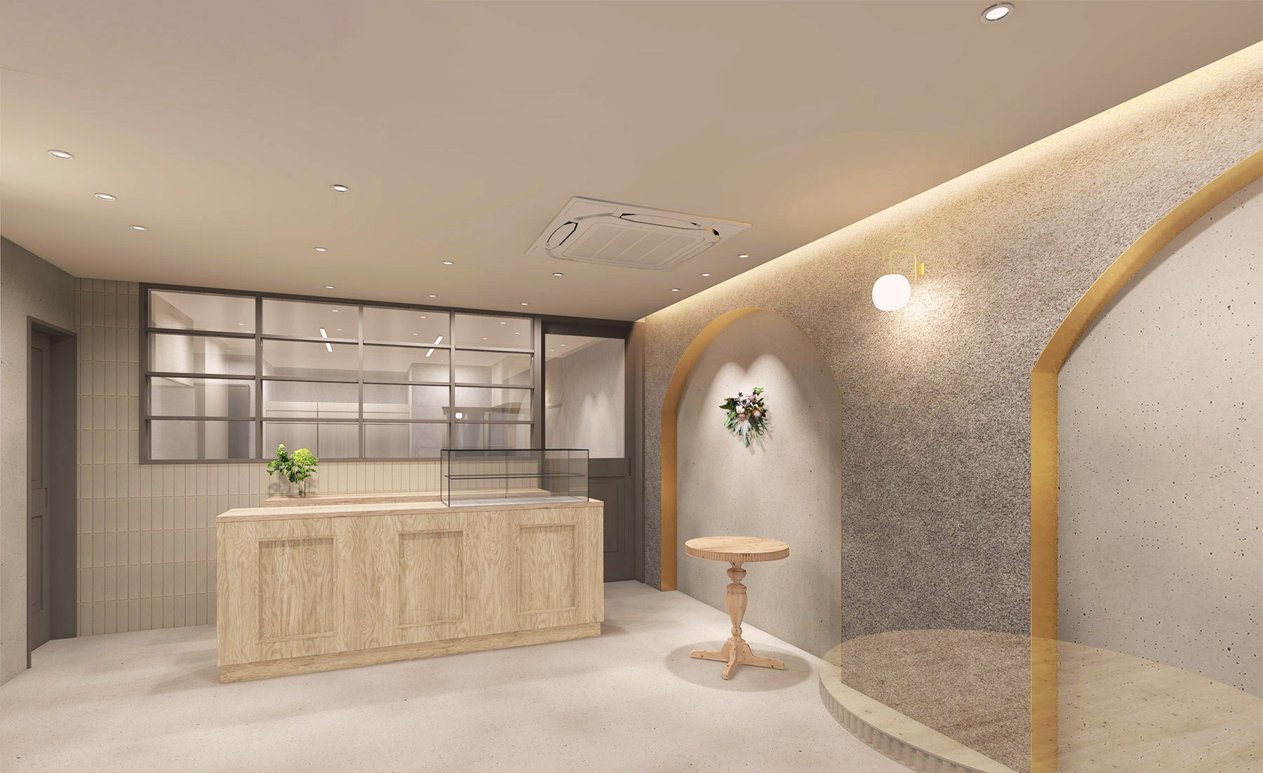 フランスパリのアトリエを想起させるグレートーンの落ち着いた雰囲気の内装に仕上げています。厨房との仕切りには大きなガラスの窓をつけ、作り手からお菓子を選ぶお客様の顔が直接見えるように設計しました。入口すぐのショーケースにはケーキやタルトなどの生菓子が並び、わくわくしながら商品をお選びいただけます。