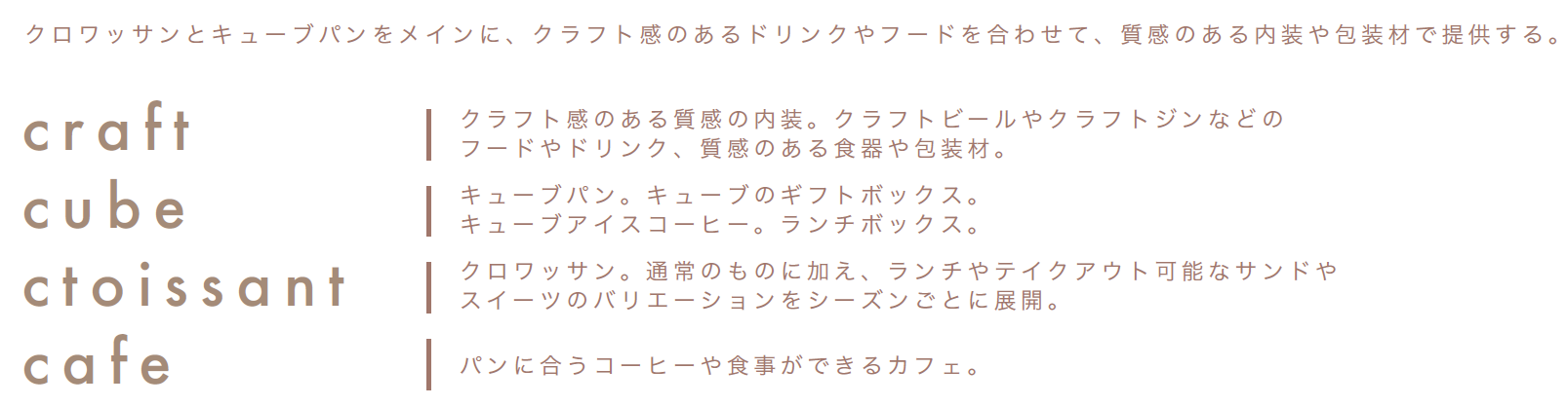 クロワッサンとキューブパンをメインに、クラフト感のあるドリンクやフードを合わせて、質感のある内装や包装材で提供します。パンと料理のおいしい組み合わせを体験、発見できる。