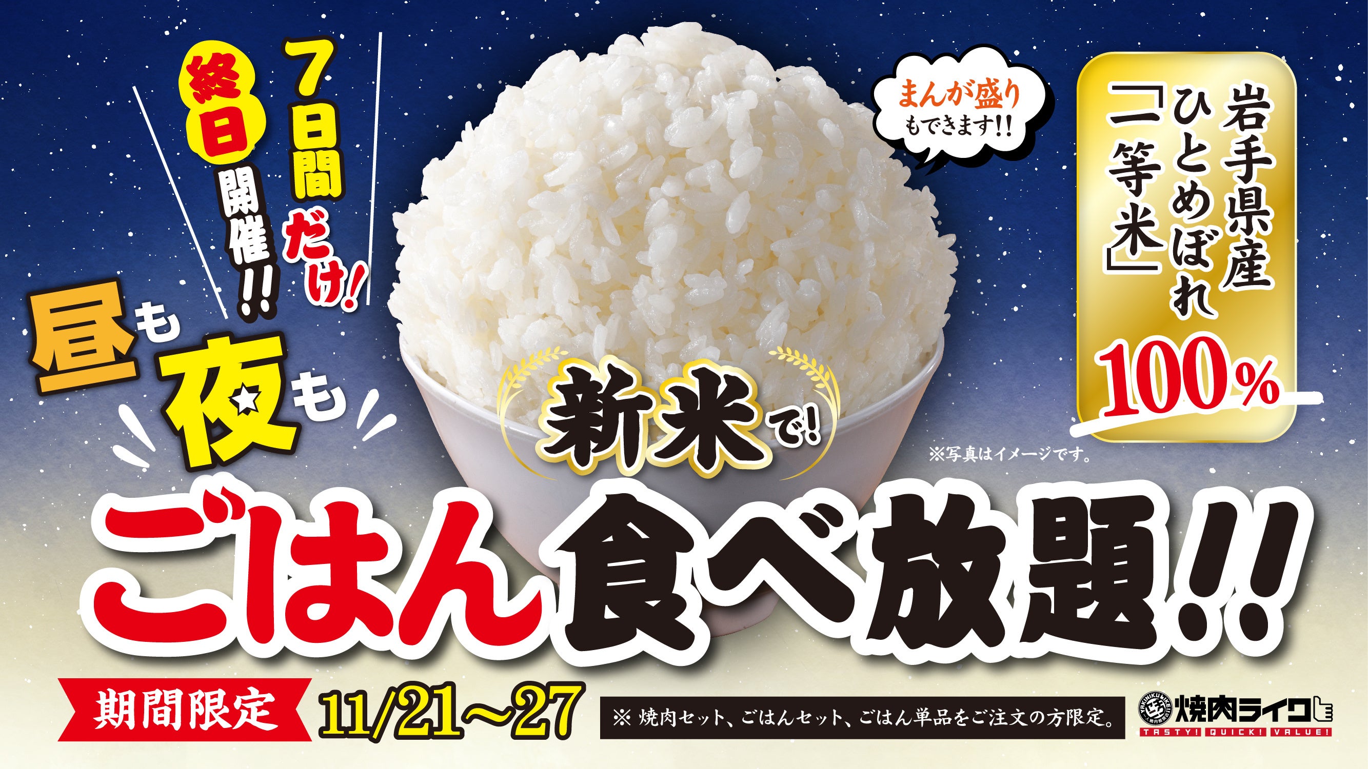 内容:「焼肉セット」「ごはん・スープ・キムチセット」「ごはん単品」をご注文のお客様は、ごはんが終日食べ放題