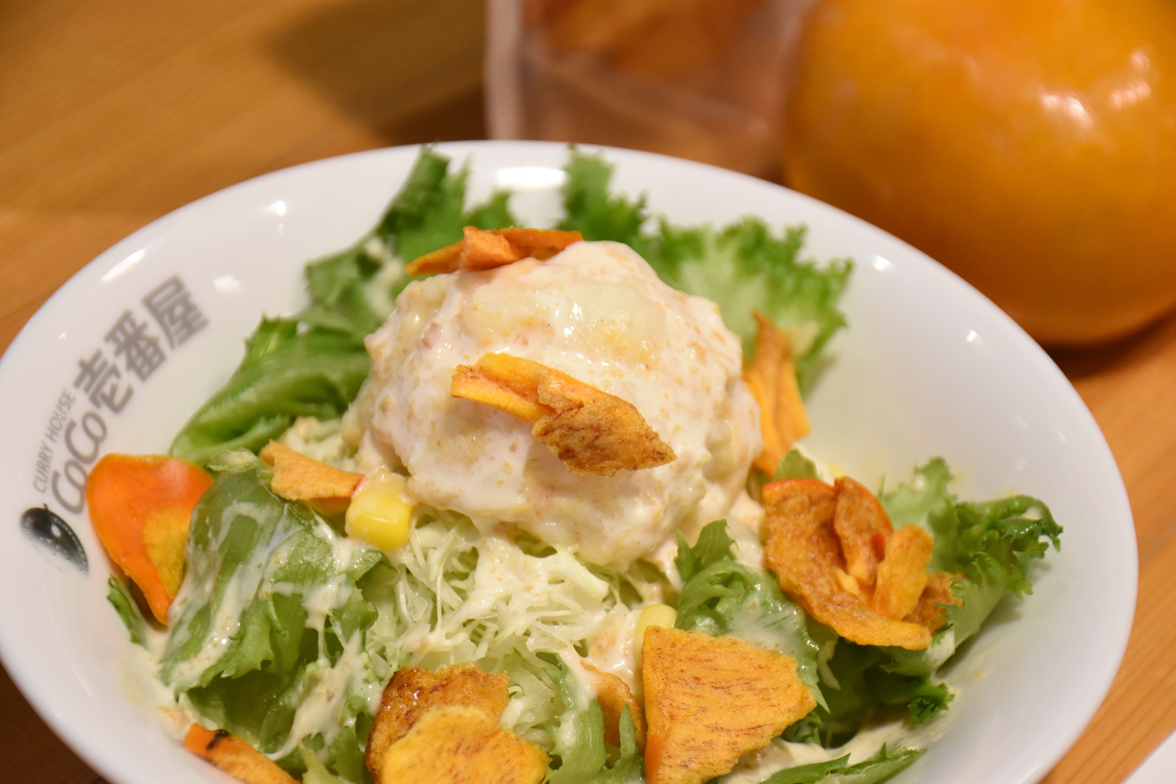 続く「カレーハウスCoCo壱番屋豊橋藤沢店」(神ノ輪町)は、次郎柿を生産する百年柿園ベル・ファームの柿ジャムをポテトサラダとドレッシングに混ぜ、その上にザクザク食感が楽しい柿チップスを振りかけました。柿の優しい甘みがスパイシーなカレーとの相性抜群な一品。提供期間は12月1日から、来年3月以降はなくなり次第終了です。