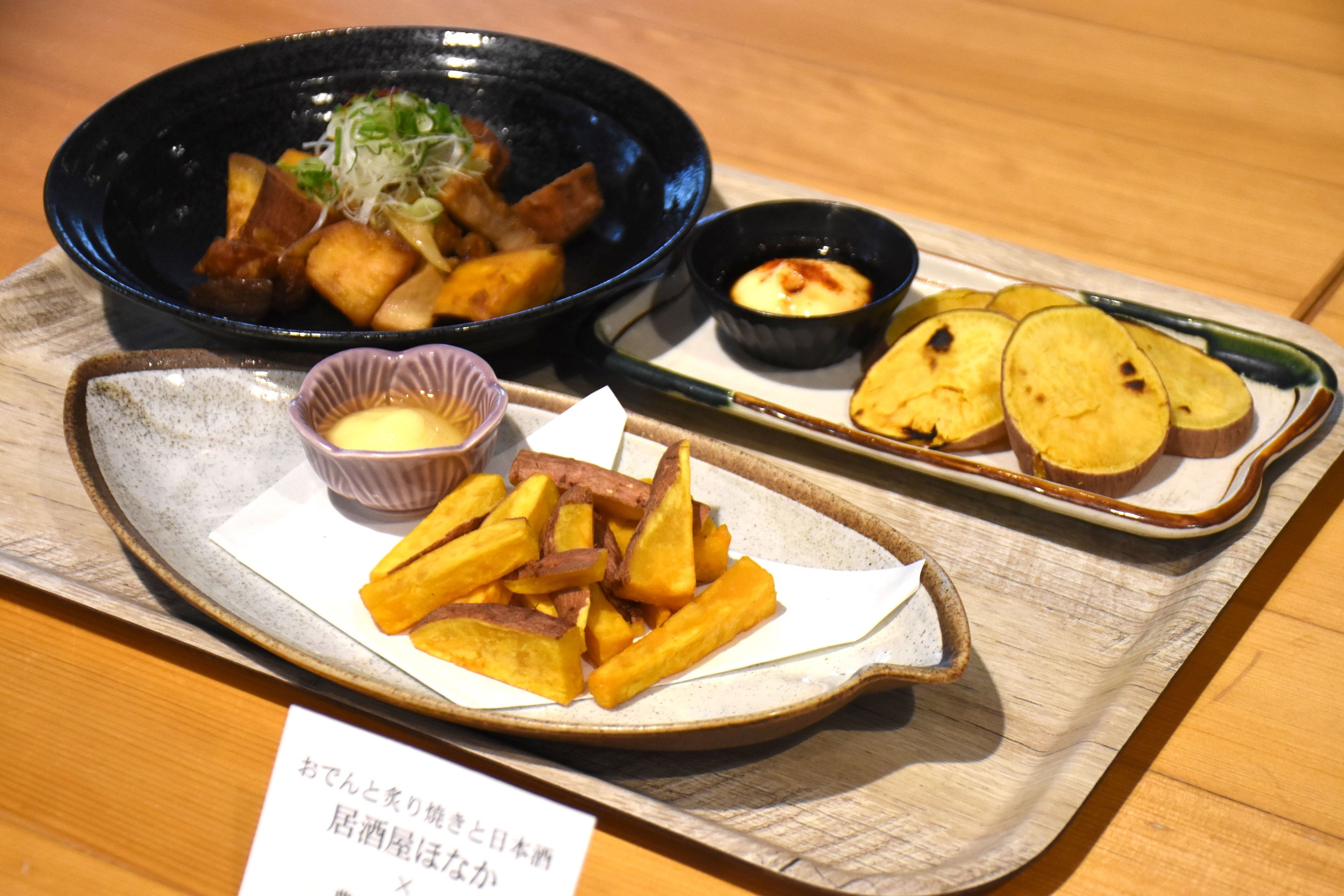 「酒と白飯に合う」サツマイモ料理3品を提案した居酒屋「ほなか」(駅前大通一丁目)。農園そもそもから仕入れた品種「あかねみのり」は、 食べた時に口の中に広がる香り高さとホクホク感が特長。特に「勝負の一品」という「さつまいもと鶏肉のガーリックバターソテー」は「炒めてニンニクと合わせても相性抜群だった」とサツマイモの新たな可能性を引き出した一品になっています。