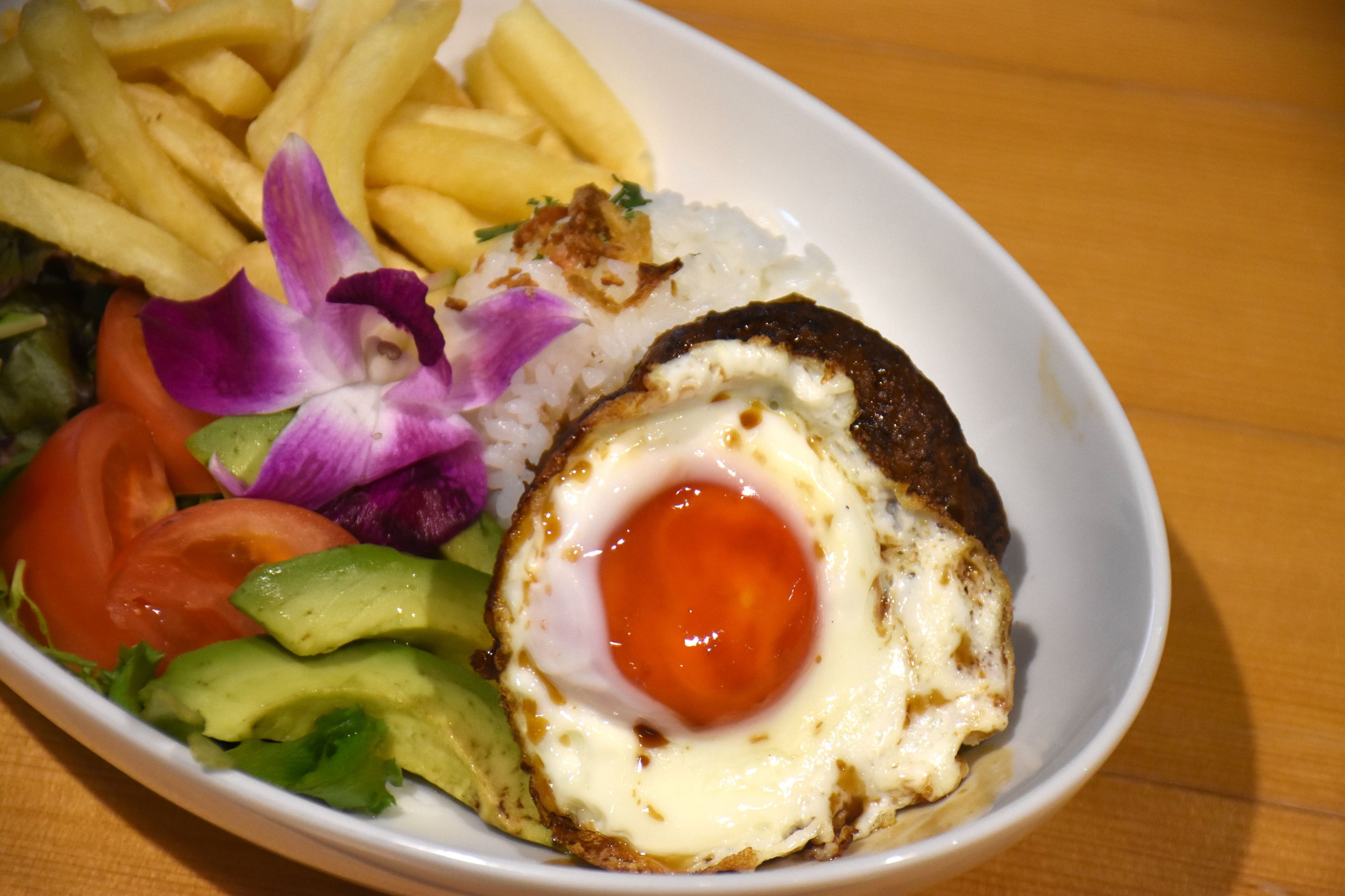 特選卵「#華音」を使用した照り焼きソースのロコモコ スープ付(1350円、 ドリンク付+130円~)