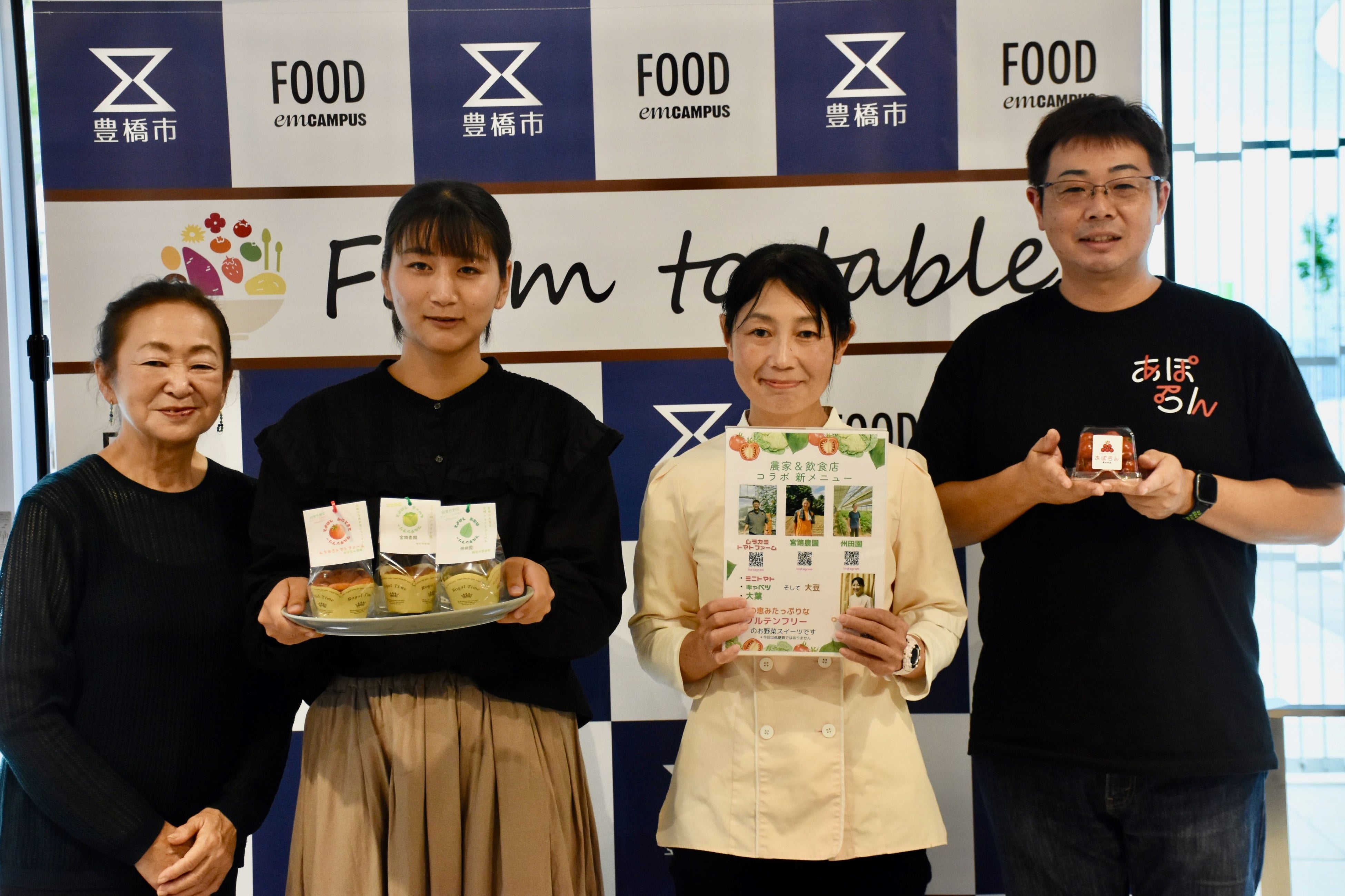 州田園は「野菜類は本当に豊富な栄養を持っていて、大葉は美容効果もとてもある野菜です。ですが、体にいいから、美容にいいからと食べるのではつまりません。本当においしく仕上げてくださっています。それを楽しんでいただけたら」。ムラカミトマトファームは「甘さと酸味のバランスがいいフルーツミニトマトの風味をしっかり感じられる、とてもおいしい、子どもでも食べられるケーキになっております。ぜひご賞味ください」。キャベツを栽培している宮路農園は「よかったら食べてみてください」と呼びかけました。