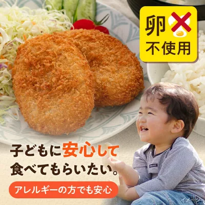 冷凍のまま揚げるだけの簡単調理、ソースなしでも美味しくお召し上がりいただける美味しいコロッケです。子どもに安心して食べてもらいたいという思いから、卵不使用による、昔ながらのコロッケを作っています。