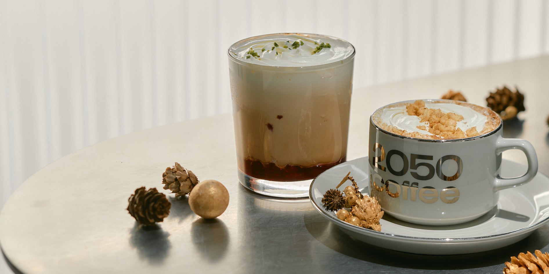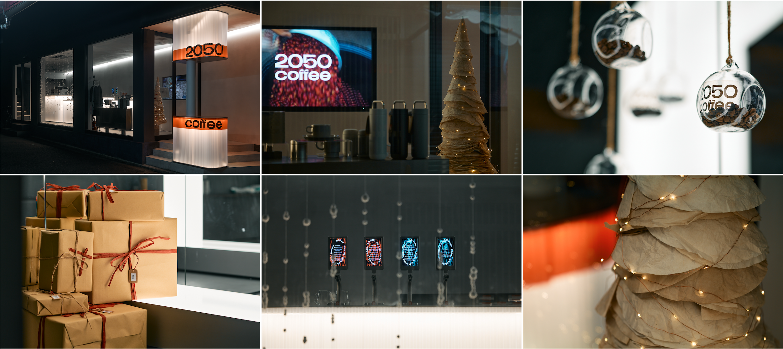 普段はスタイリッシュで近未来的な空間、世界観が目を引く2050 COFFEEの店内が、ホリデーシーズンに合わせて”温かみ”を感じさせる空間に。コーヒーフィルターを再利用したツリーをはじめ、自然素材や再利用可能素材を用いてサステナビリティを意識したデコレーションは、自然やコーヒーの”温かさ”を感じさせながら、クリスマスならではの特別な雰囲気をもたらします。社会と環境に配慮したサステナブルなコーヒー豆(コスタリカ、エチオピア産を予定)もタップコーヒーでお楽しみいただけます。