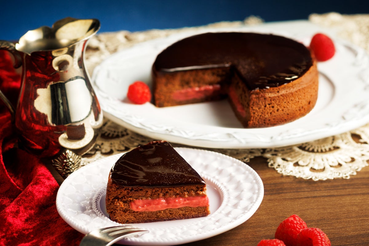 コク深く甘さ控えめのビターチョコレートと甘酸っぱいラズベリーの組み合わせが相性抜群の特製ケーキをお楽しみください。