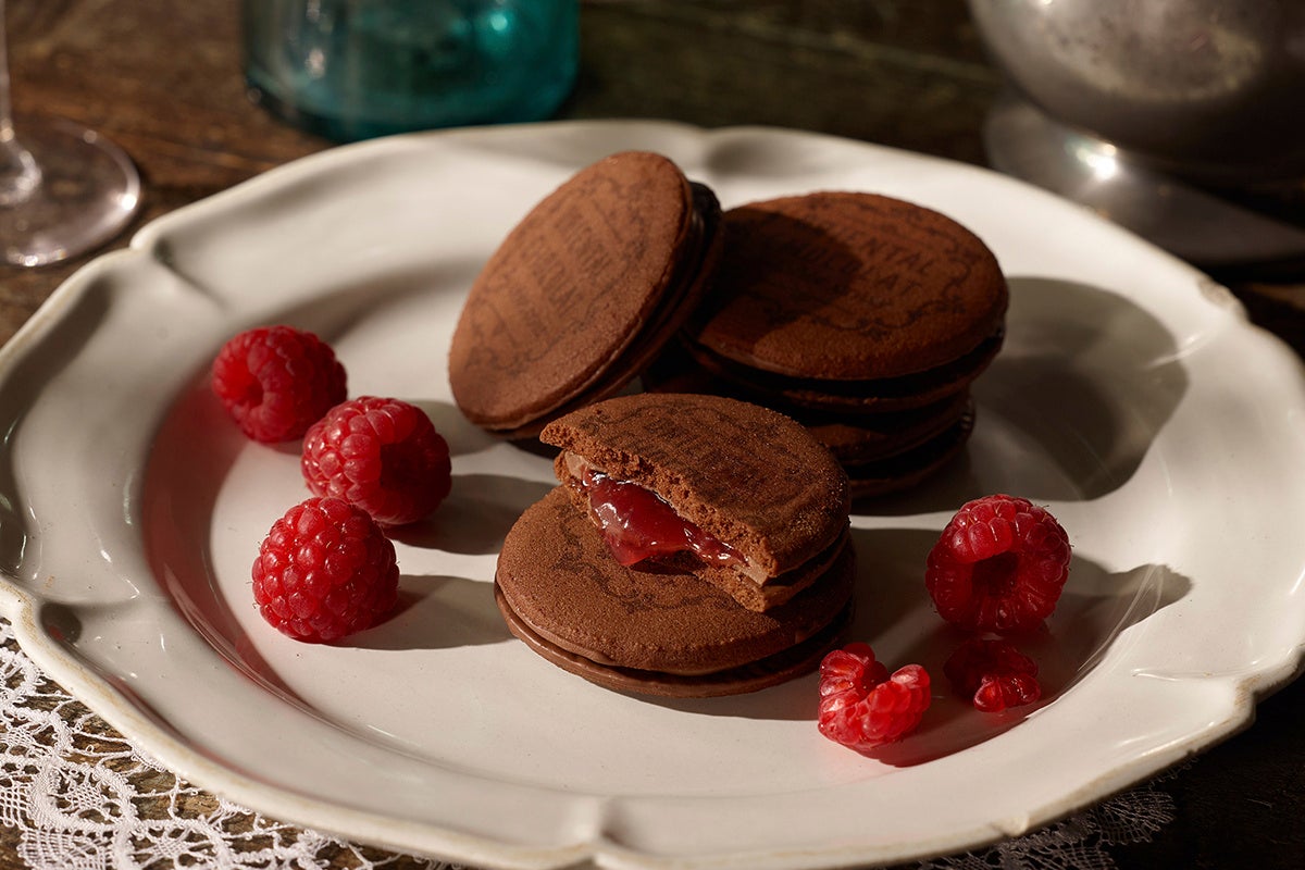 風味豊かなラズベリーソースを、ミルクチョコレートでコーティングし、ココアクッキーでサンドした、贅沢な味わいのサンドクッキーです。濃厚なチョコレートの風味と、ラズベリーの爽やかな酸味のコントラストをお楽しみいただけます。