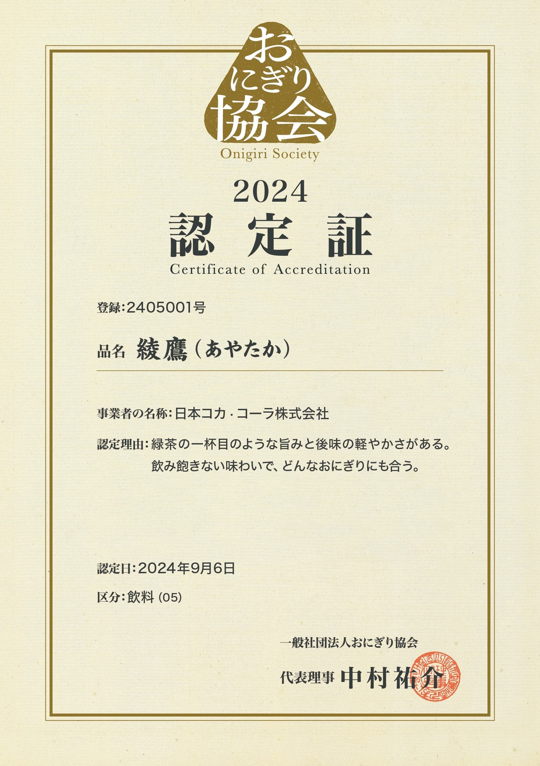 「綾鷹」は、今年の秋、おにぎりを通じて和食文化を国内外に普及させる取り組みをする一般社団法人おにぎり協会より、緑茶の一杯目のような旨みと後味の軽やかさがあること、飲み飽きない味わいでどんなおにぎりにも合うことが評価され、ペットボトル緑茶ブランドとして初めて、おにぎり協会の認定緑茶になりました。