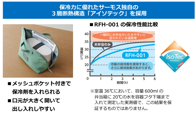 ケースの形状がコンパクトかつ取っ手が付いているので、カバンから出し入れしやすい仕様です。また、ケースの口元が大きく開くので、お弁当を簡単に出し入れできます。ポーチ内側のメッシュポケットには保冷剤を入れることができ、サーモス独自の3層断熱構造「アイソテック」によってお弁当をしっかりと保冷します。洗濯機の使用が可能なので、お手入れも簡単です。サイズは、約600mlまでのお弁当箱を入れられる『保冷ランチケース(RFH-001)』と約700~1000mlのお弁当箱を入れられる『保冷ランチケース(RFH-002)』を用意しました。