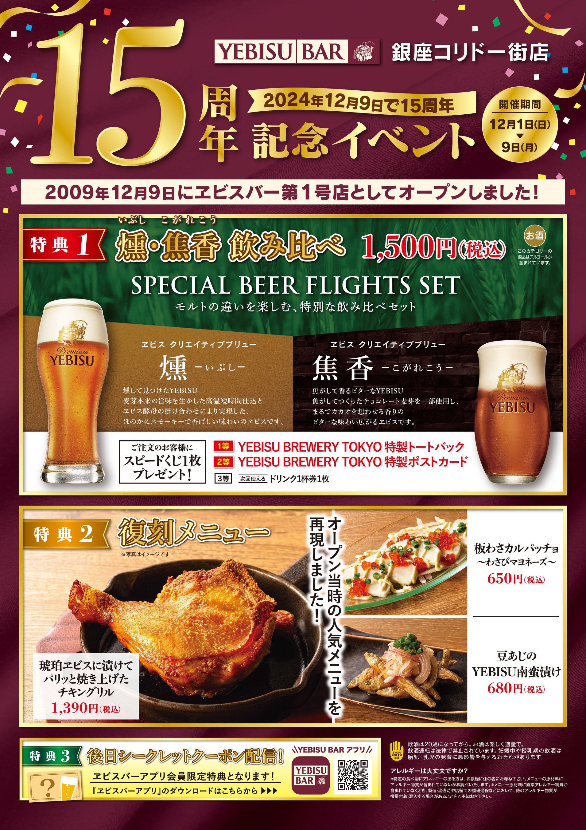 「YEBISU BAR 銀座コリドー街店」は、ヱビスの魅力をもっと味わっていただくため“ALL FOR YEBISU ~ヱビスの全てが、ここにある。~”をコンセプトに、サッポロライオンとサッポロビールがともに構想を重ねて誕生したビヤバー「YEBISU BAR」の1号店として2009年にオープンし、この度、本年12月9日で開店15周年を迎えます。