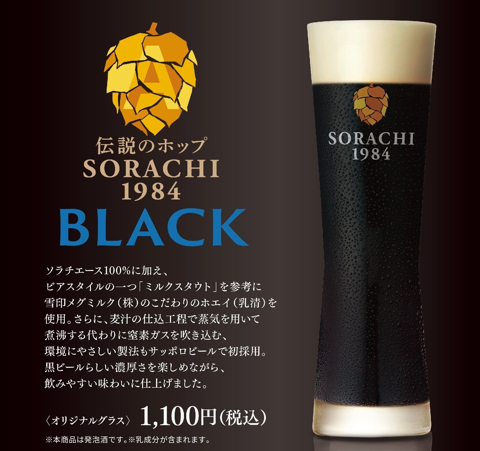 「サッポロ SORACHI 1984 BLACK」は、伝説のホップ・ソラチエース100%に加え、ミルクスタウトというビアスタイルを参考に、雪印メグミルク㈱のこだわりのホエイ(乳清)を使用し、環境にやさしい製法でつくられた、黒ビールらしい濃厚さがありながらマイルドで飲みやすい味わいの黒ビールテイスト(※)です。