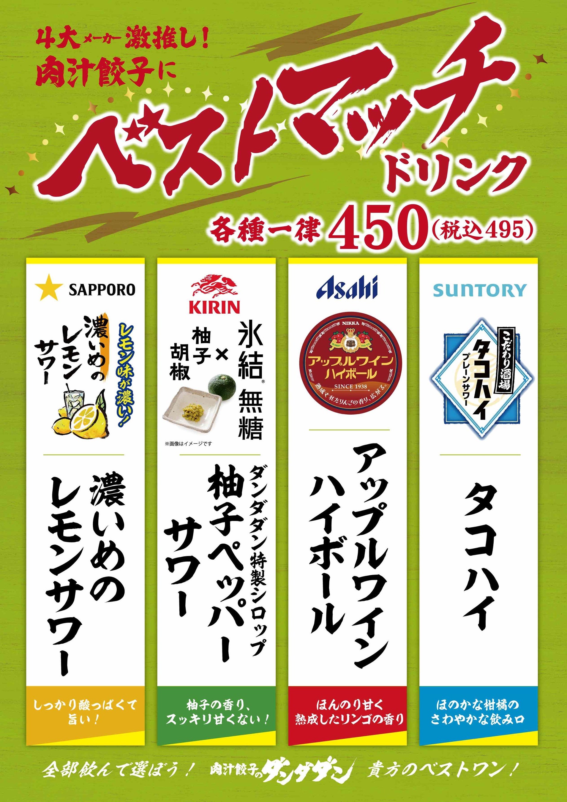 12月1日(日)より約1ヵ間、4大メーカー(SUNTORY、SAPPORO、KIRIN、Asahi)とタイアップし、各社が一押しする「肉汁餃子に合うドリンク」を、肉汁餃子のダンダダン全店舗で提供します。