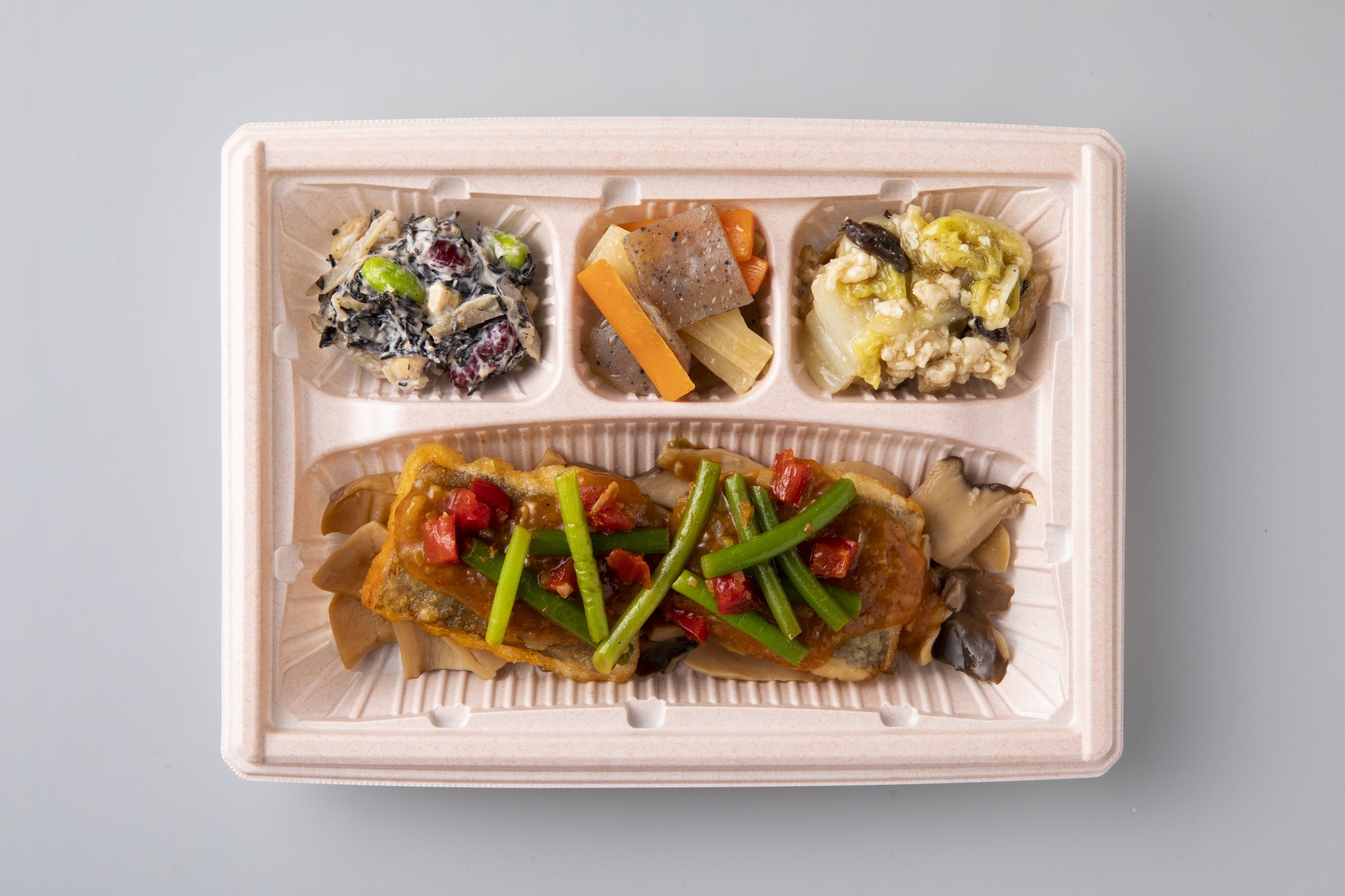 献立は日替わりで、130万人が利用する「おいしい健康」アプリで人気の高いメニューを採用し、管理栄養士が設計しております。毎日23万食以上を作り続けるワタミの自社工場で製造し、「ワタミの宅食」の担当スタッフが、毎日、冷蔵にてお届けいたします。