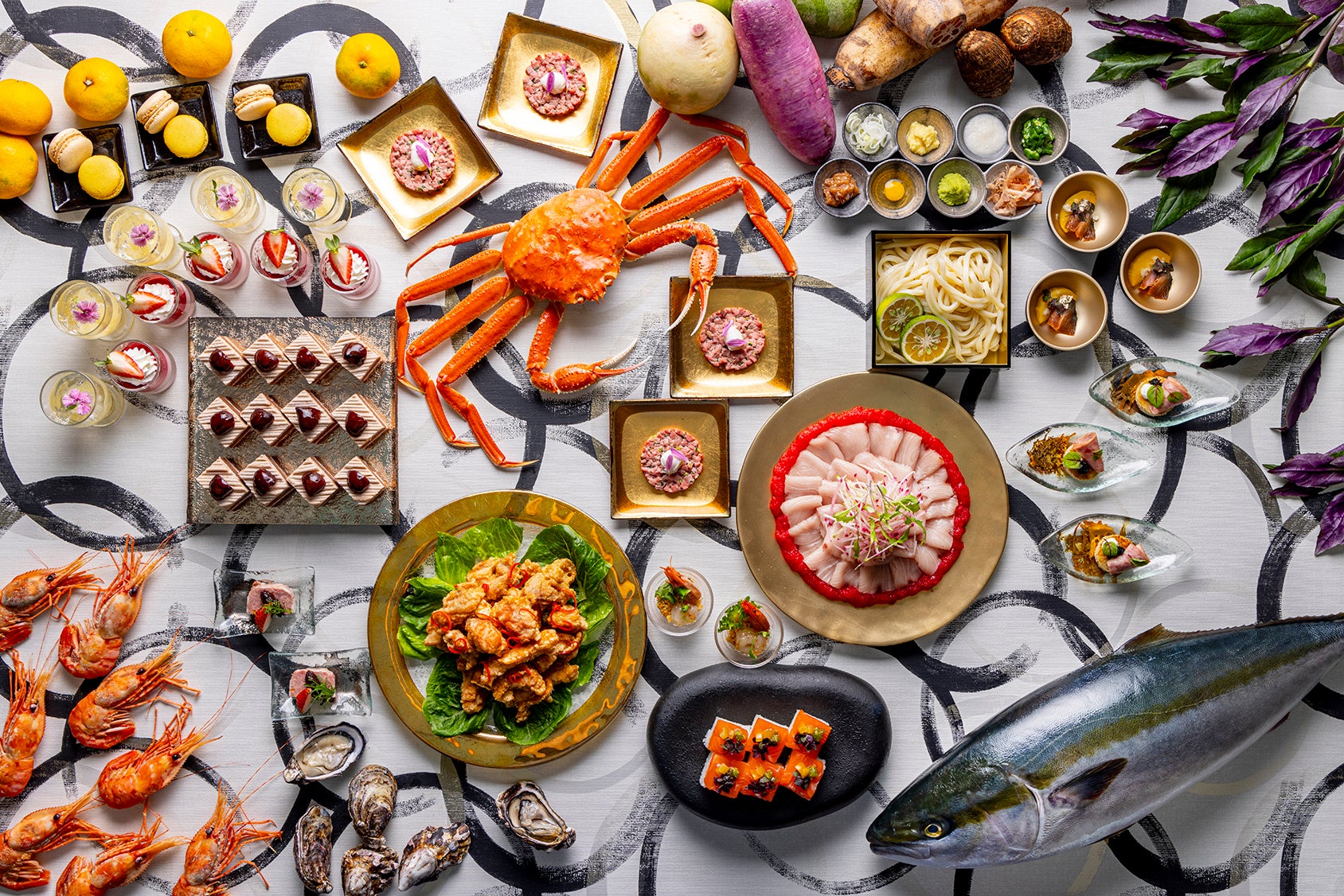 「シェフズ・トリート・ランチビュッフェ~冬の北陸~」では、富山県産のイノシシや北陸のガスエビなど珍しい食材に加え、ブランド食材や加賀野菜など、美しい自然が生んだ北陸の食材をふんだんに使用した料理をお届けします。注目は、毎回人気を博しているクラブステーションの「ズワイガニ」。カニ酢やレモンなどの定番のコンディメントに加え、新潟県の伝統的な香辛料であるかんずりを使用したかんずり豆乳クリームなど、お好みの調味料とともにお楽しみいただけます。
