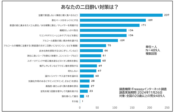 2024年11月、大正製薬株式会社が「二日酔いの経験がある」人489人を対象に「取り入れている二日酔い対策」について調査したところ、多い順に「空腹で飲酒しない(事前に軽く食べるなど)」237人、「飲むペースをゆっくりにする」189人、「飲酒の前に真水をたくさん摂る/水を頻繁に飲む/チェイサーを用意する」171人、「睡眠をしっかり取る」と「ウコンやタウリン・しじみサプリなどを飲む」が同列で134人という順でした。