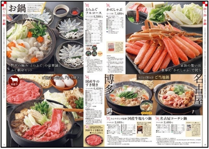 バラエティ豊かな鍋を取り揃えており、豪華なお鍋で食卓に彩りを加えます。メインの具材だけでなく、野菜や豆腐、鍋の素など必要な食材も一緒にお届けするので、鍋料理を手軽に楽しむことができます。