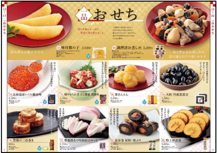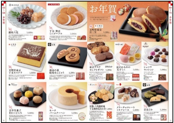 縁起の良い和菓子やスイーツを包装済みでお届けします。同カタログに掲載しているので、おせちを選ぶ際に年始のご挨拶も一緒に選べるのがうれしいポイントです。