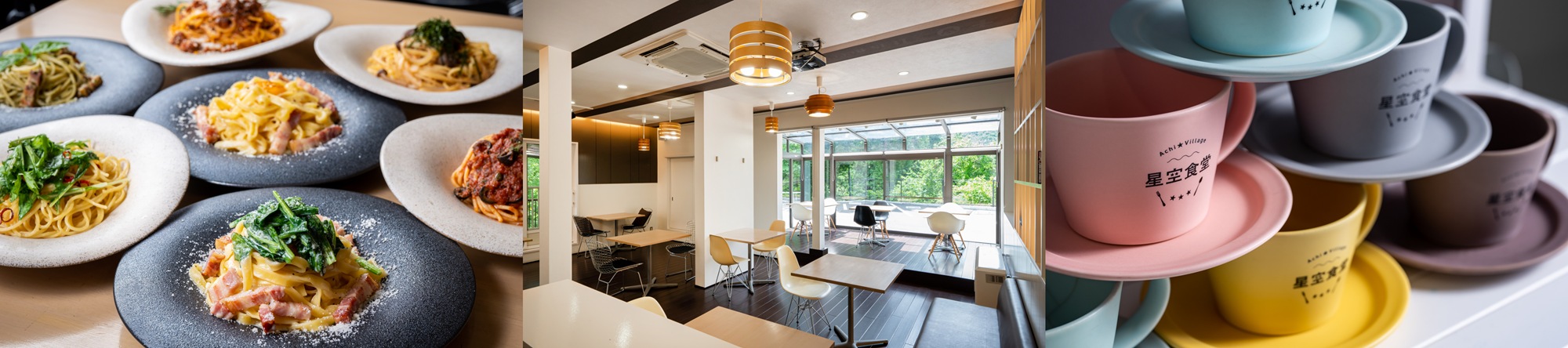 日本一の星空の村にある「阿智村 星空食堂」は昼神温泉の玄関口に位置しています。ピザ、パスタをはじめ、信州プレミアム牛やジビエ、信州サーモンなど阿智村や信州の食材を使った料理が楽しめるレストラン・食堂・カフェです。