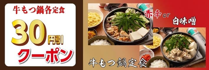 宮本むなし公式アプリでは、12月24日まで何度でも使える「牛もつ鍋各定食30円引き」クーポンを配信いたします。会員の方限定でご利用いただけるクーポンですので、この機会にぜひ宮本むなし公式アプリをダウンロード&会員登録ください。