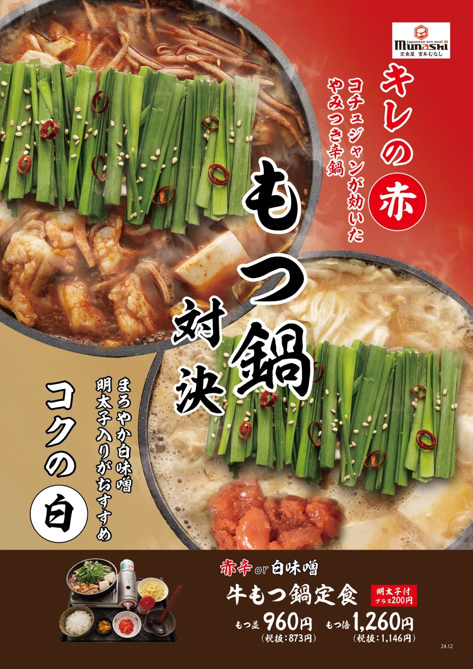 M&Sフードサービス株式会社(本社:大阪府大阪市、代表取締役社長:夏井 克典)が運営する定食チェーン「定食屋 宮本むなし」では、博多名物「牛もつ鍋定食」、牛もつをたっぷり食べたい方向けに「牛もつ鍋定食(もつ倍盛)」、さらに明太子付きのセットを2024年12月11日(水)より期間限定で販売開始します。
