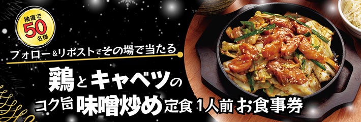 「鶏とキャベツのコク旨味噌炒め定食1人前のデジタルお食事券」を抽選で50名様にプレゼント。