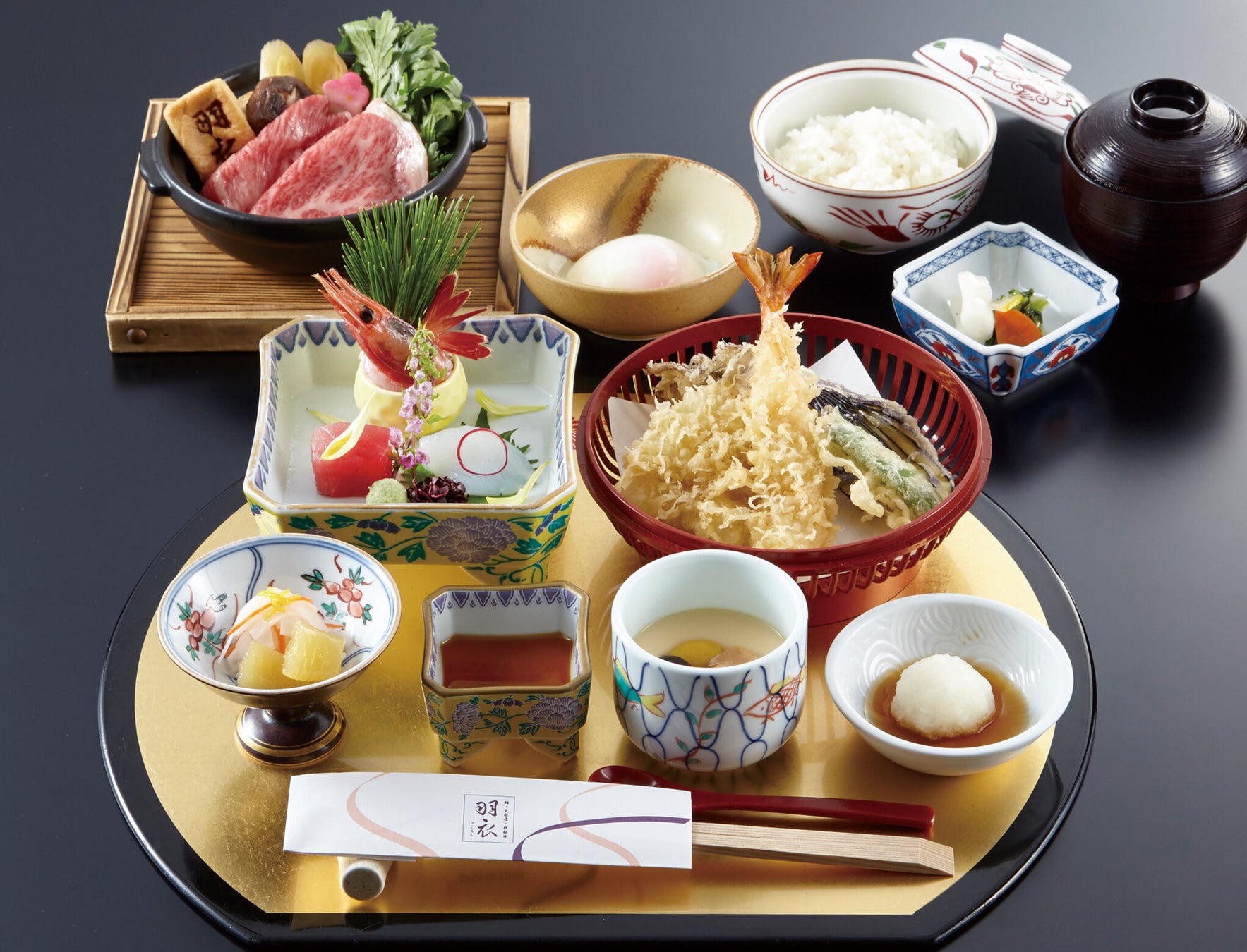 新年の会食にぴったりな彩り豊かなディナー会席と、平日ランチ限定の和牛すき鍋御膳を期間限定でご提供します。テーブル席や個室もご用意できる「羽衣」での新年会はいかがでしょうか