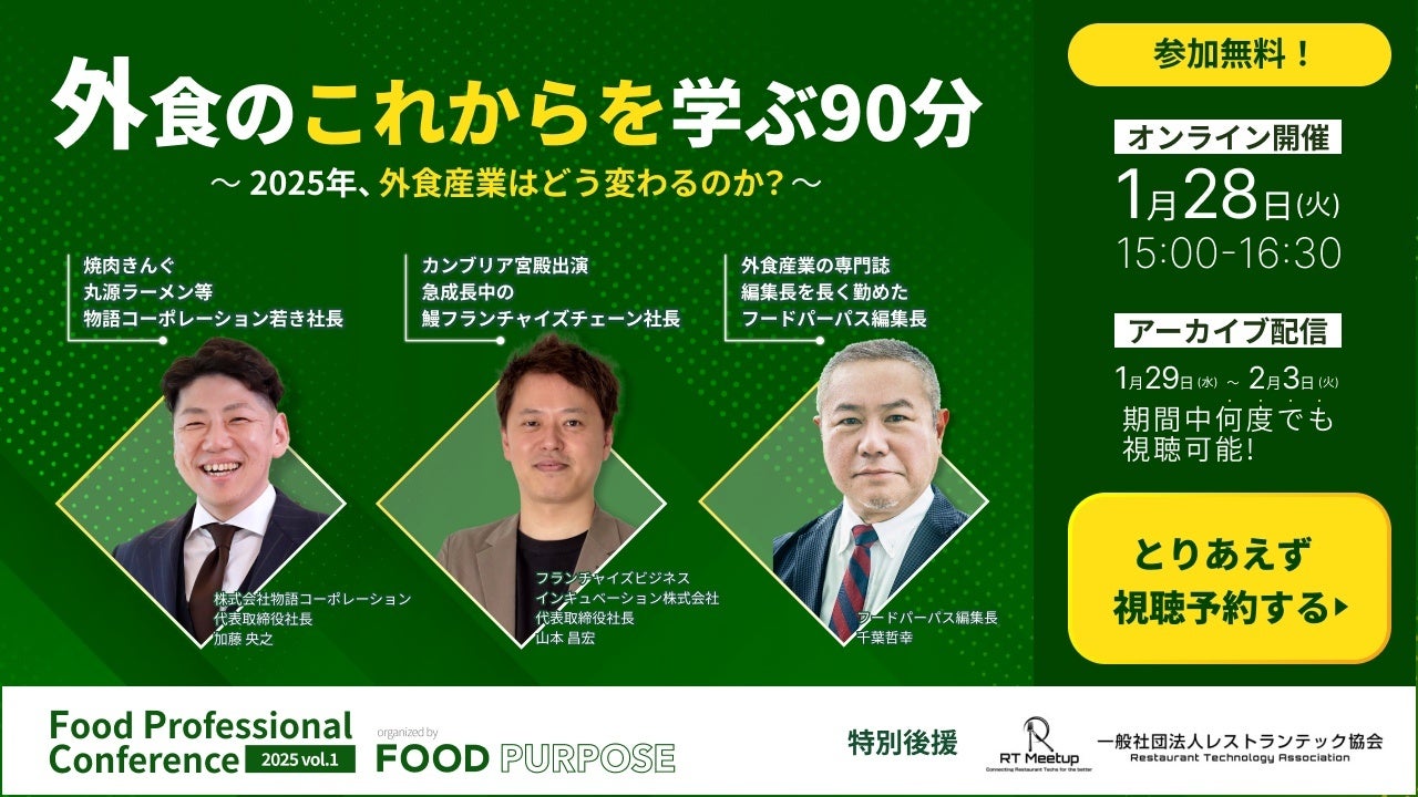 外食産業向けのWEBメディア『FOOD PURPOSE:フードパーパス』の企画・運営で、外食産業のこれからを学ぶ90分の特別イベント「フードプロフェッショナルカンファレンス2025」を1月28日に開催をいたします。