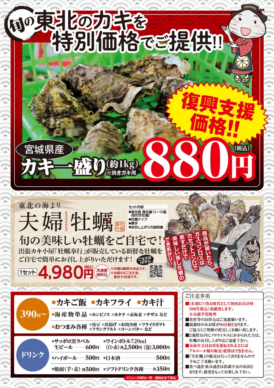 ▶︎東日本大震災で販路に苦しむ東北の牡蠣を多くの人に食べてほしいとの思いで、冬季限定の東北復興支援イベントとして全国各地で展開。