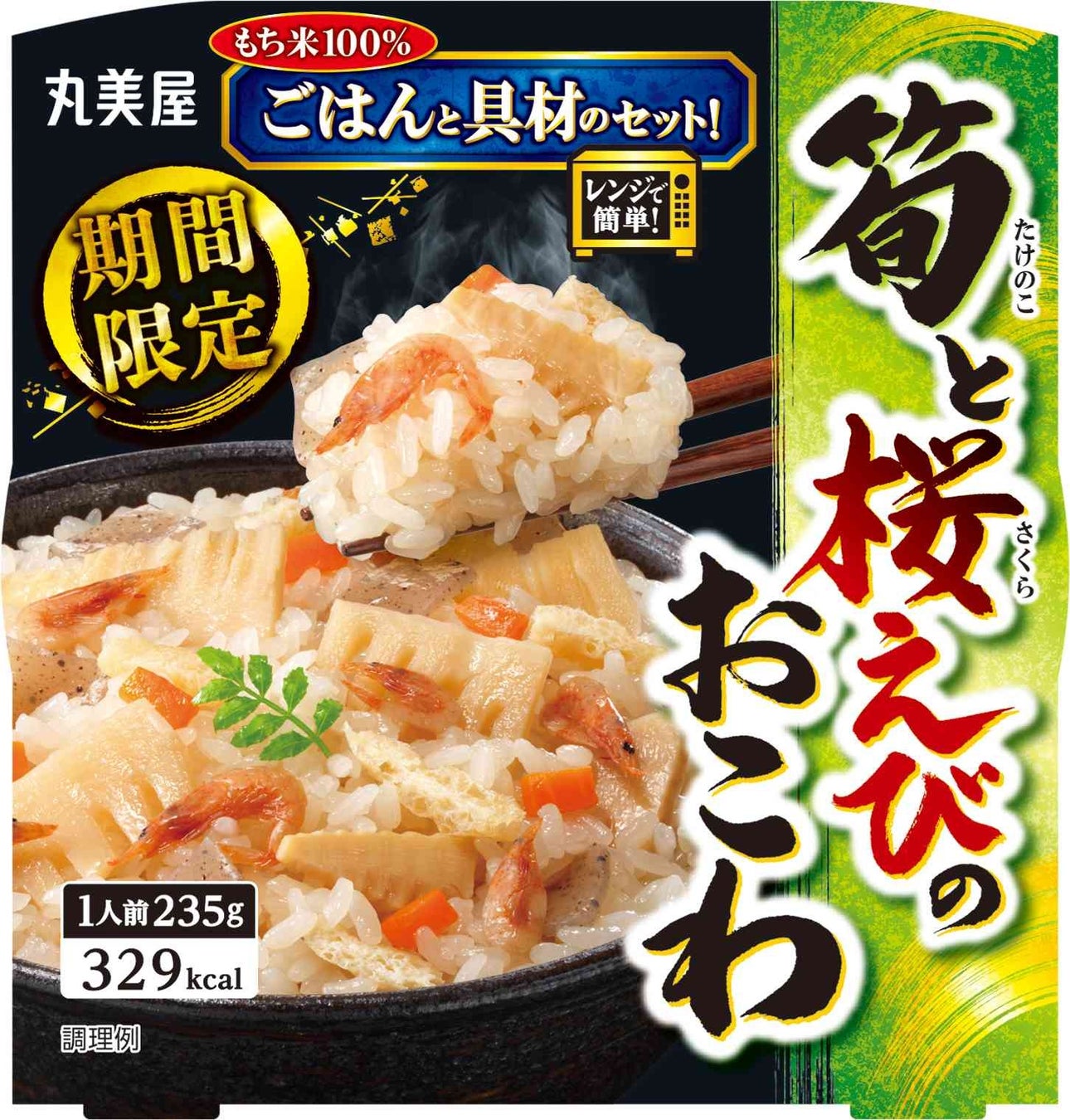 シャキシャキとした歯ごたえがよい大きめの筍と桜えびが楽しめるあっさりした味わいに仕上げました。筍、にんじん、桜えび、こんにゃく、油揚げが入ってプレミアム感を演出しています。国産もち米を100%使用。おこわシリーズは一食で満足感があるので、炊飯の手間なく素早く食事をしたい時にもおすすめです。