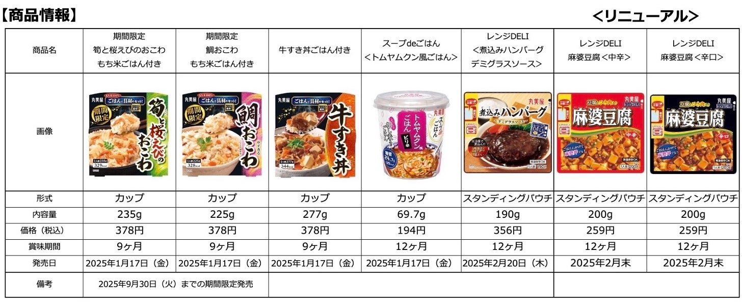 丸美屋食品工業株式会社(本社:東京都杉並区、社長:阿部豊太郎)は、レンジ調理や湯さし調理で簡単・手軽に楽しめる「ごはんシリーズ」「レンジDELIシリーズ」の新しい商品を2025年1月17日(金)、2月20日(木)にそれぞれ発売いたします。