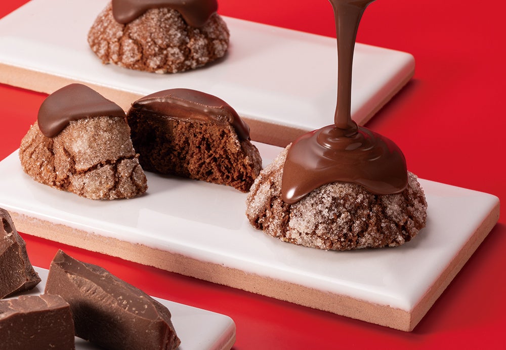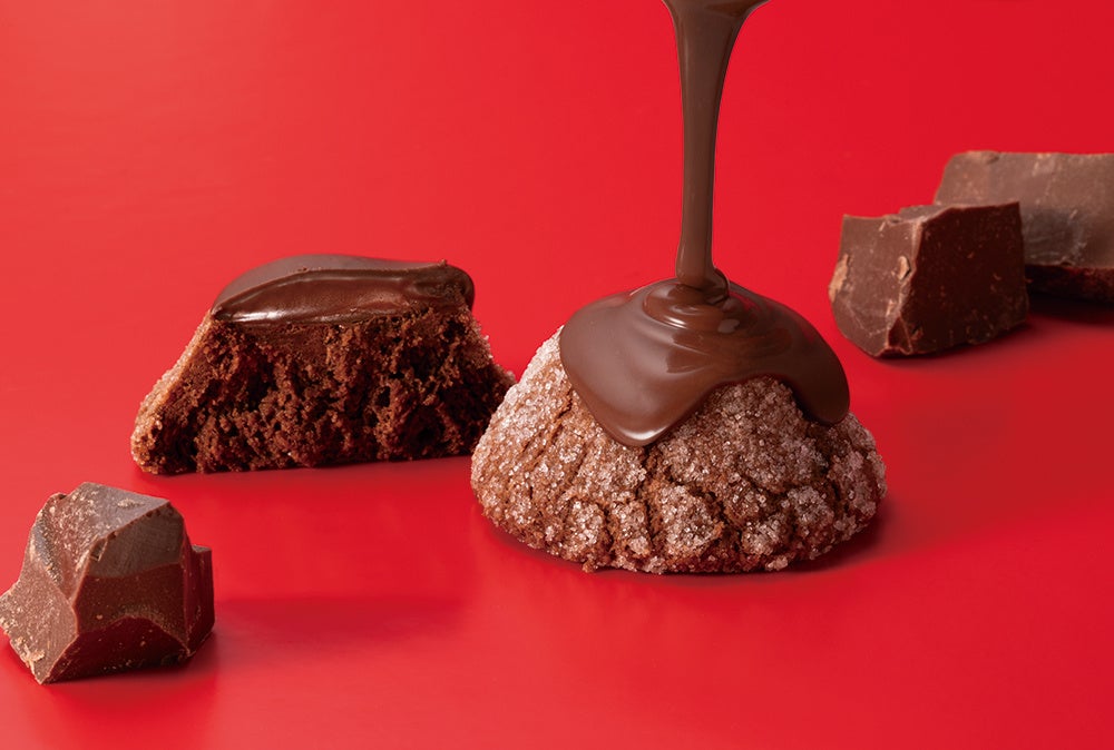 濃厚なコクたっぷりのショコラバタークッキーにココアパウダーを練り込んだなめらかなホイップショコラをとじこめ、さらに上からスイートチョコレート入りのコーティングチョコをとろりと流しかけました。クッキーはバター含有率33%を誇るフレーバーバター味『バターステイツクッキー ショコラバター』を使用し、ショコラづくしの一品に仕上げています。今だけ出会えるショコラフォンデュの美味しさをお楽しみください。