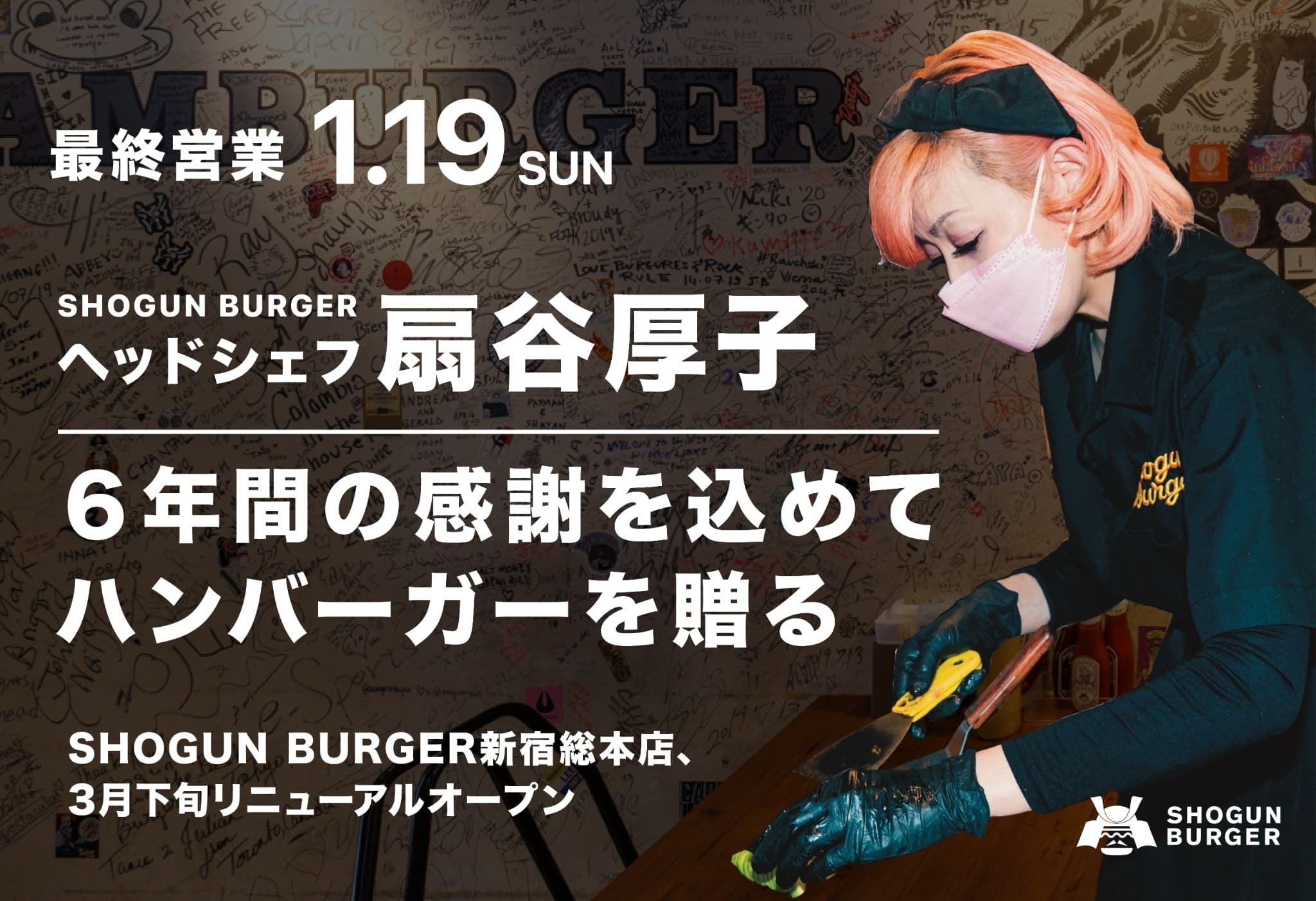 株式会社ガネーシャ (所在地:富山県富山市、代表取締役:本田大輝) が運営するSHOGUN BURGER新宿総本店、1月19日に扇谷厚子が一夜限りの登場!3月下旬にリニューアルOPEN決定。