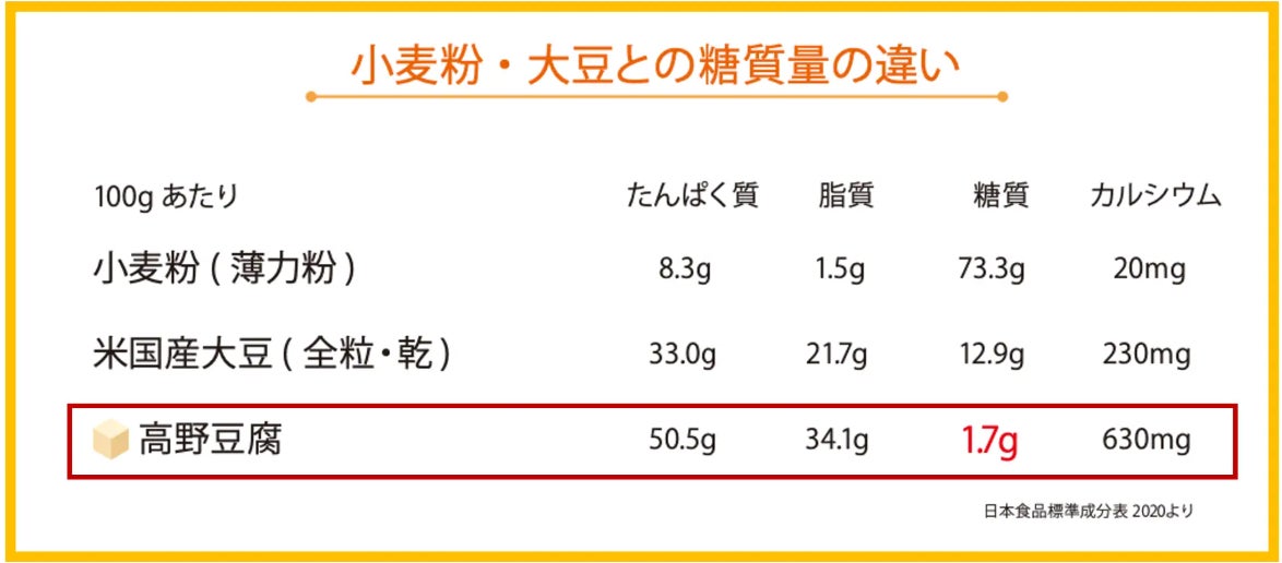 糖質の摂り過ぎは、糖尿病や肥満に繋がる恐れがありますが、高野豆腐は、穀物類やいも類などと比べても、糖質の量が非常に少ないのが特徴。お菓子作りなど、小麦粉の代わりに高野豆腐を使うことで、無理なく糖質をカットできるほか、お肉の代わりとして使うこともできるので、アレンジ次第で、さまざまな健康レシピに活用いただけます。