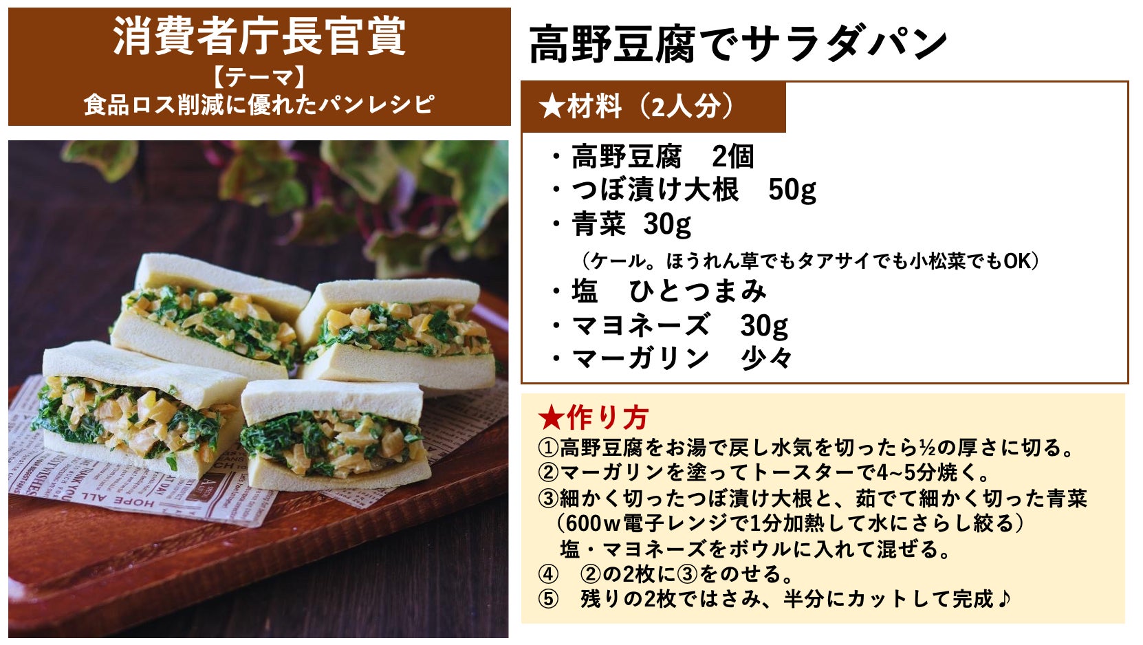 全国凍豆腐工業協同組合連合会(会長:木下博隆)は、日本の伝統食材であり、ヘルシーでボリューム満点の「こうや豆腐」をもっと自由に楽しんでいただくため、11月1日よりパンの代わりにこうや豆腐を使った「#こうや豆腐でパンレシピ」を募集、あっと驚く魅力的なレシピを250作品以上、ご応募いただきました。テーマごとに、一次審査、二次審査、試食審査を経て 「消費者庁長官賞(食品ロス削減レシピ)」「長野県知事賞(アイデアレシピ)」「こうや豆腐普及委員会賞(簡単レシピ)」各賞が決定しました。