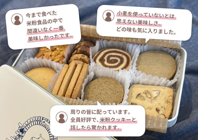 「小麦を使っていないとは思えない美味しさ。どの味も気に入りました。」「初めて購入した後に他のクッキー巡りをしましたが、こちらの米粉クッキーをどうしても食べたくて再度購入いたしました。」