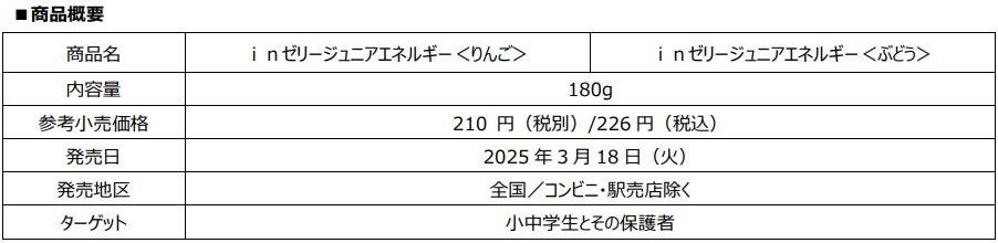 森永製菓株式会社(東京都港区芝浦、代表取締役社長・太田 栄二郎)は、忙しい現代人の健康維持と毎日の生活を前向きにサポートする「inゼリー」ブランドから、スポーツや学習に取り組む前のエネルギーと成長期にうれしい栄養を配合したゼリー飲料「inゼリージュニアエネルギー<りんご>」「inゼリージュニアエネルギー<ぶどう>」を3月18日(火)より新発売いたします。