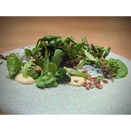 温前菜の「桜鱒とジャガイモのクレープ 鴨のカプチーノ」では、昆布茶で下味を施した桜鱒を軽く炙ってクレープ生地で覆い、鴨肉と鶏の出汁に生クリームを合わせカプチーノ仕立てでご用意します。もっちりとしたクレープに、桜鱒の上品な脂と甘みが「出汁香るカプチーノ」と見事なマリアージュを演出。塩味と酸味のアクセントとして「アブルーガキャビア」を添え仕上げました。ディナータイムのメインの一皿である「海苔を纏った仔牛肉のパイ包み焼き」では、日本伝統の調味料である塩麴でマリネした仔牛肉の中心にフォアグラとトリュフソースを忍ばせ、海苔で巻いて複合的なパイ包みに仕立てます。付け合わせには「木の芽味噌」で和えた季節の野菜を彩り良く添え、マデラソースでお楽しみいただけます。デザートは「和三盆糖」を使用した「アーモンドのブランマンジェとメロンのソース 煎茶のアイスを添えて」をご用意します。初夏から旬を迎えるメロンを使用したソースと、煎茶風味のアイスを添え「菊の花びら」をあしらい「和」を演出しました。