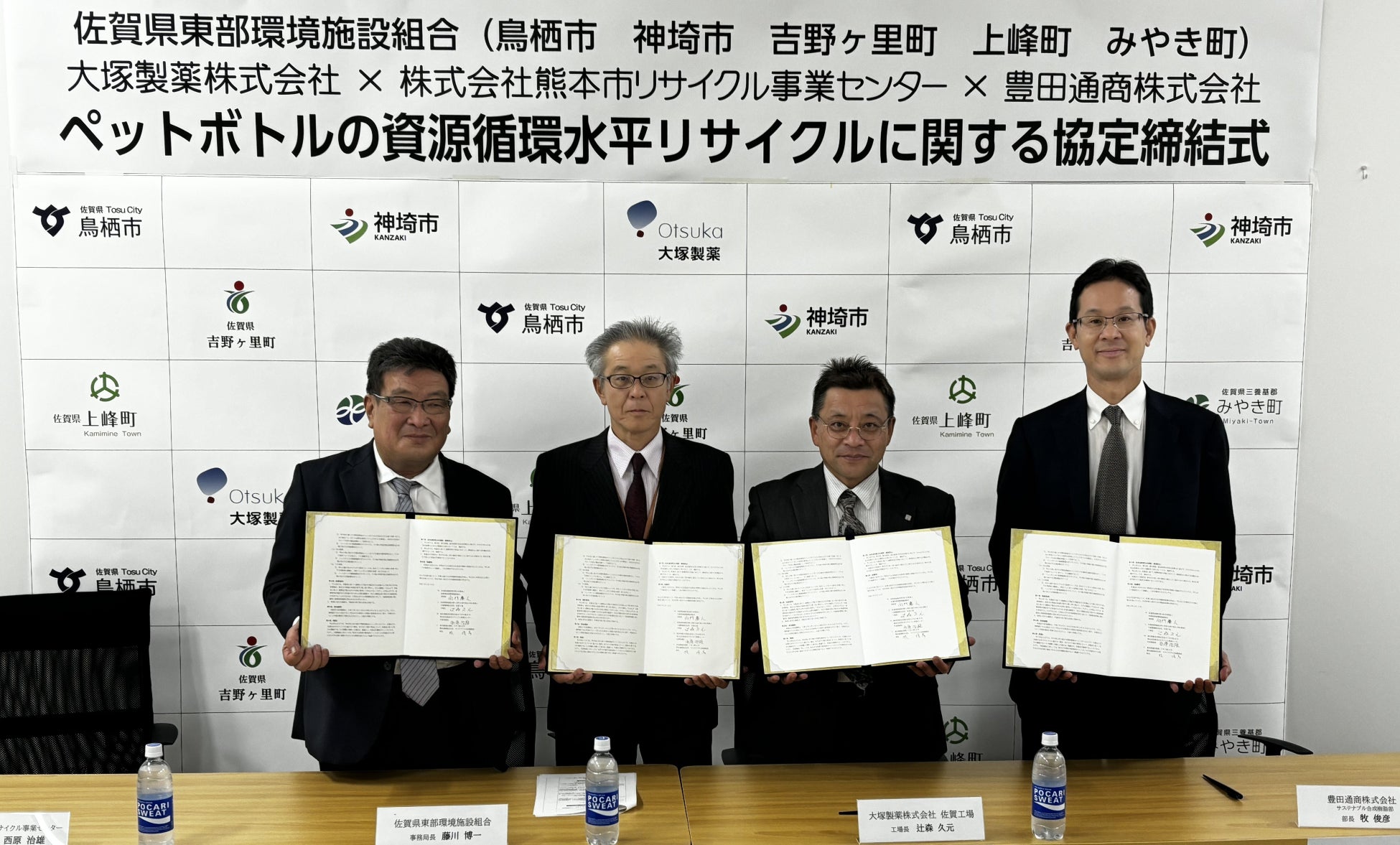 大塚製薬株式会社(本社:東京都、代表取締役社長:井上 眞、以下「大塚製薬」)は持続可能な社会の実現を目指し、佐賀県東部環境施設組合(管理者:鳥栖市長 向門 慶人、事務局長:藤川 博一)、株式会社熊本市リサイクル事業センターおよび豊田通商株式会社と3月14日にペットボトルの資源循環水平リサイクルに関する協定を締結しました。自社工場所在地で回収されたペットボトルを再びペットボトルの原料として工場で利用する「地産地消型ペットボトルリサイクル」の取り組みを当社佐賀工場においても実施し、地域と連携したペットボトルの「ボトルtoボトル*1」水平リサイクルのさらなる推進を目指します。