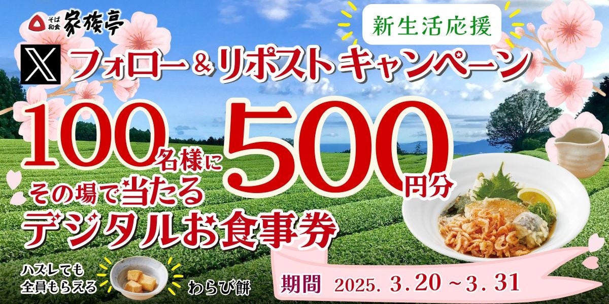 株式会社家族亭(本社・大阪府大阪市、代表取締役社長・坪山 憲司)が運営するそば和食チェーン「家族亭」は、2025年3月20日(木)午後8時~3月31日(月)の期間に、家族亭公式Xで「家族亭デジタルお食事券 500円分」が抽選で100名様に当たる家族亭公式「新生活応援Xフォロー&リポストキャンペーン」を開催いたします。家族亭の公式Xをフォローし、キャンペーンポストをリポストすることで参加ができ、当たりがその場ですぐに分かります。デジタルお食事券の抽選に惜しくも外れた方も、期間中に何度でも使える「わらび餅サービスクーポン」がもらえるとてもお得なキャンペーンです。ぜひこの機会にキャンペーンにご参加ください。
