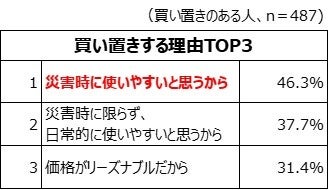 ・水の買い置きをしている人は71%となり、理由のトップは「災害時に使いやすい」ことでした。防災意識の高まりから水の備蓄が一般的となり、水分補給だけではない水の用途が広がっていると捉えています。