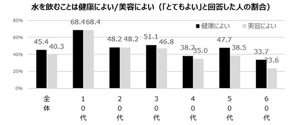 ・水と健康に関する意識では、健康に「とても良いと思う」、美容に「とても良いと思う」といずれも68.4%が回答。20-30代と比べ20ポイントほど、40-60代と比べ30ポイントほど高く、水が自身の健康と美容にリンクしていると考えるからこそ積極的に水を選び、意識的に飲むようになったと考えられます。