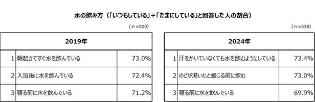 ・水の飲み方として、5年前の2019年の上位3項目は「朝起きてすぐ水を飲んでいる」「入浴後に水を飲んでいる」「寝る前に水を飲んでいる」でしたが、2024年の上位3項目は「汗をかいていなくても水を飲むようにしている」「のどが渇いたと感じる前に飲む」「寝る前に水を飲んでいる」となりました。以前はのどが渇いた状態の水分補給として飲用されていましたが、現在はのどが渇く前に意識的に水を飲むような変化がおきたと捉えています。