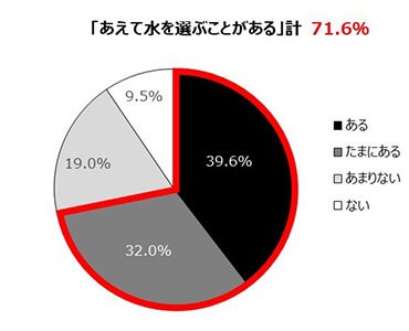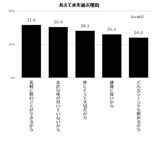 ・71.6%の方が「日常生活の中で飲み物を選ぶときに、あえて水を選ぶことがある」と回答。その理由として「気軽に飲むことができるから」、「余計な味が付いていないから」、「体にとって大切だから」の順で多く挙げられました。気兼ねなく選べることや、無味無臭であることに価値を感じていることが分かりました。