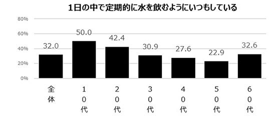 ・水の飲み方において、「一日の中で定期的に水を飲むようにしている」と答えた人の割合が、他年代と比較して10ポイントほど高く、意識的に水を飲むようにしていることが伺えます。