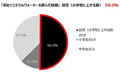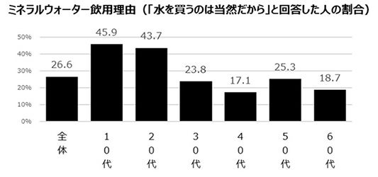 ・初めてミネラルウォーターを飲んだ時期は半数が「幼児(小学校に上がる前)」と回答。あわせて、飲み水として「水を買うのが当然だと思う」という意識も45.9%と30-60代よりも20ポイントほど高く、幼い頃から家庭内にミネラルウォーターがあり慣れ親しんできた“ミネラルウォーター・ネイティブ”であると考えます。