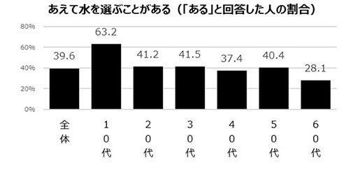 ・「あえて水を選ぶこと」においても、他年代よりも20ポイント以上高く、特に60代と比較すると35ポイントほど差があり、若年層はさまざまな飲料カテゴリーの中で積極的に水を選んでいることが分かりました。