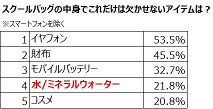 ・高校生を対象とした外部調査※4において、“スクールバッグの中身でこれだけは欠かせないアイテム”として「イヤフォン」「財布」「モバイルバッテリー」に次いで4位に「水/ミネラルウォーター」がランクイン。選んだ理由としては「こまめに飲むようにしているからないと困る」といった声だけでなく、「小腹が空いたときや眠気覚ましに飲んでいるので必須アイテム」という声も見受けられました。高校生の中では“いつも持ち歩くものの定番”として定着している様子が伺えます。