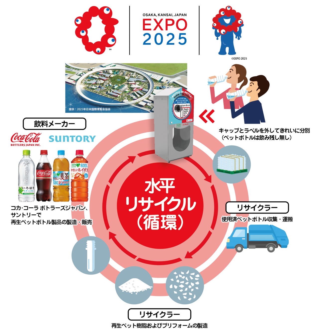 コカ・コーラ ボトラーズジャパン株式会社(本社:東京都港区、代表取締役社長 最高経営責任者:カリン・ドラガン、以下、コカ・コーラ ボトラーズジャパン)とサントリー食品インターナショナル株式会社(本社:東京都港区、代表取締役社長:小野真紀子、以下、サントリー)は協働し、2025年4月13(日)に開幕する2025年日本国際博覧会(以下、大阪・関西万博)会場内に設置する「3R(スリーアール)ステーション」(注1)で収集される使用済みペットボトルの水平リサイクル「ボトルtoボトル」に取り組みます。